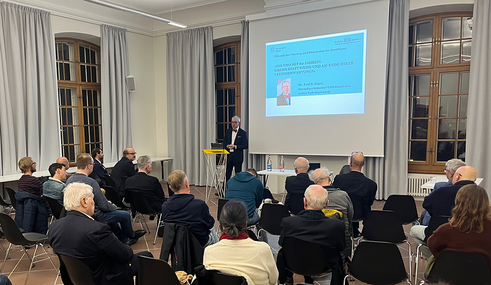 A particular highlight followed the annual meeting of our Förder- und Alumniverein on 4 November 2025: Dr. Paul R. Seger, former Swiss Permanent Representative to the UN in New York, delivered a public lecture titled “Die UNO mit 80 Jahren: Greise statt Weise und am Ende ihrer Lebenserwartung?” He traced the UN’s post-1945 trajectory, reflected on the pressures facing liberal multilateralism today, and argued for a sober, less idealised view of the organisation—one that keeps human security, climate-related risks, and the practical work of negotiation firmly in sight. In many ways, these reflections also resonate with our own work: they remind us why careful analysis, open debate, and interdisciplinary ways of thinking matter—especially at a time when global crises can make the future feel both urgent and uncertain.